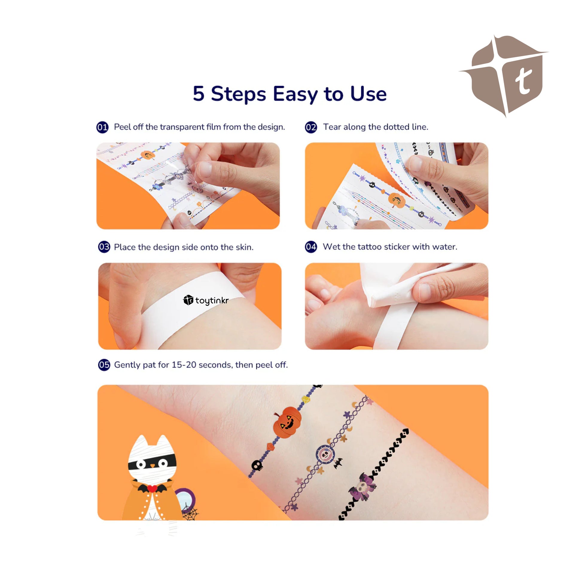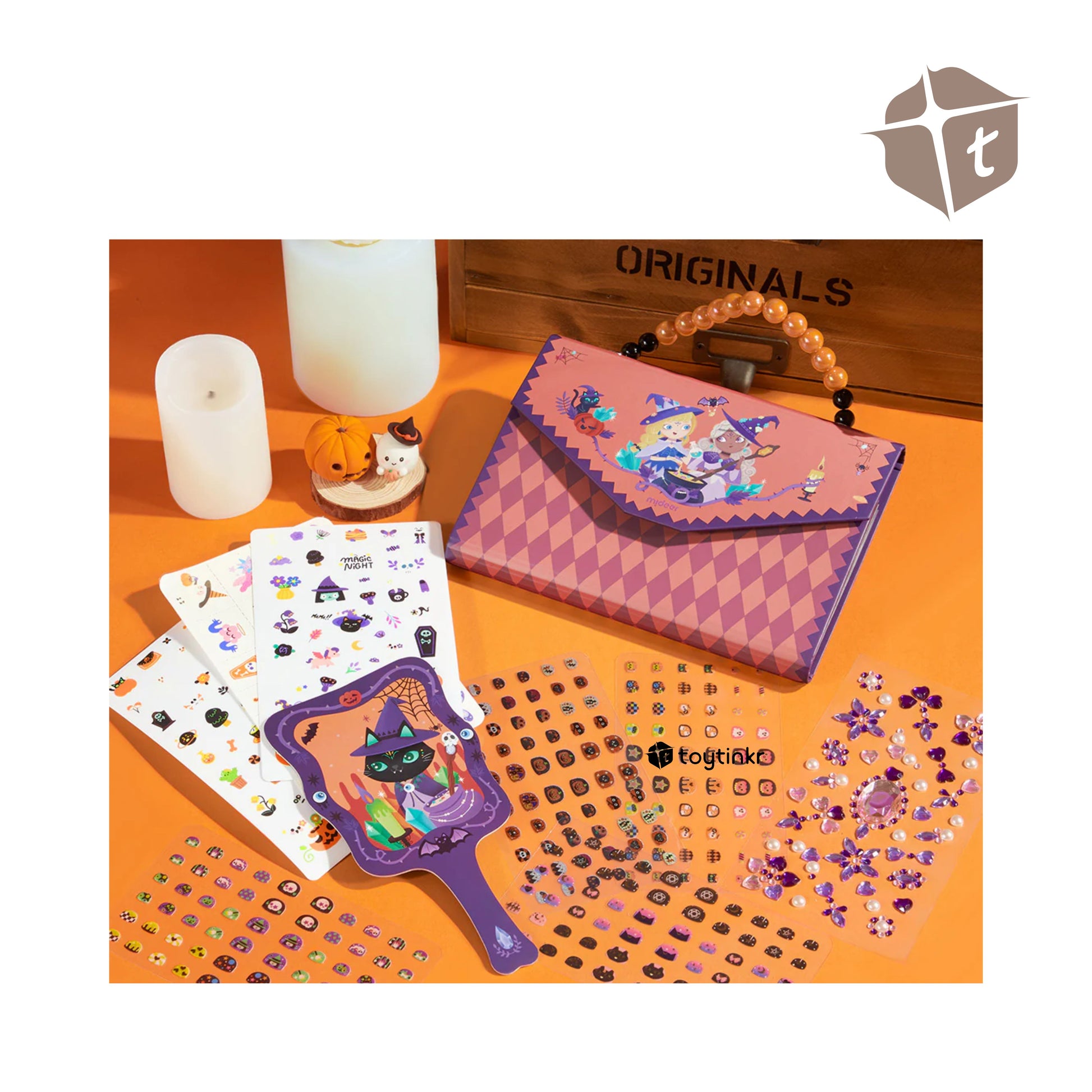 "Halloween Dress Up Sticker Pack" is an all-in-one set, perfect for creating unique and eye-catching looks for Halloween parties. It features a variety of temporary tattoos, nail stickers, and gemstone decals. Children and adults alike can explore their creativity by mixing and matching different tattoos and nail stickers to create their perfect Halloween look. Simply peel and stick to apply, and use the convenient storage pouch to keep everything organized and easy to transport to parties and events.