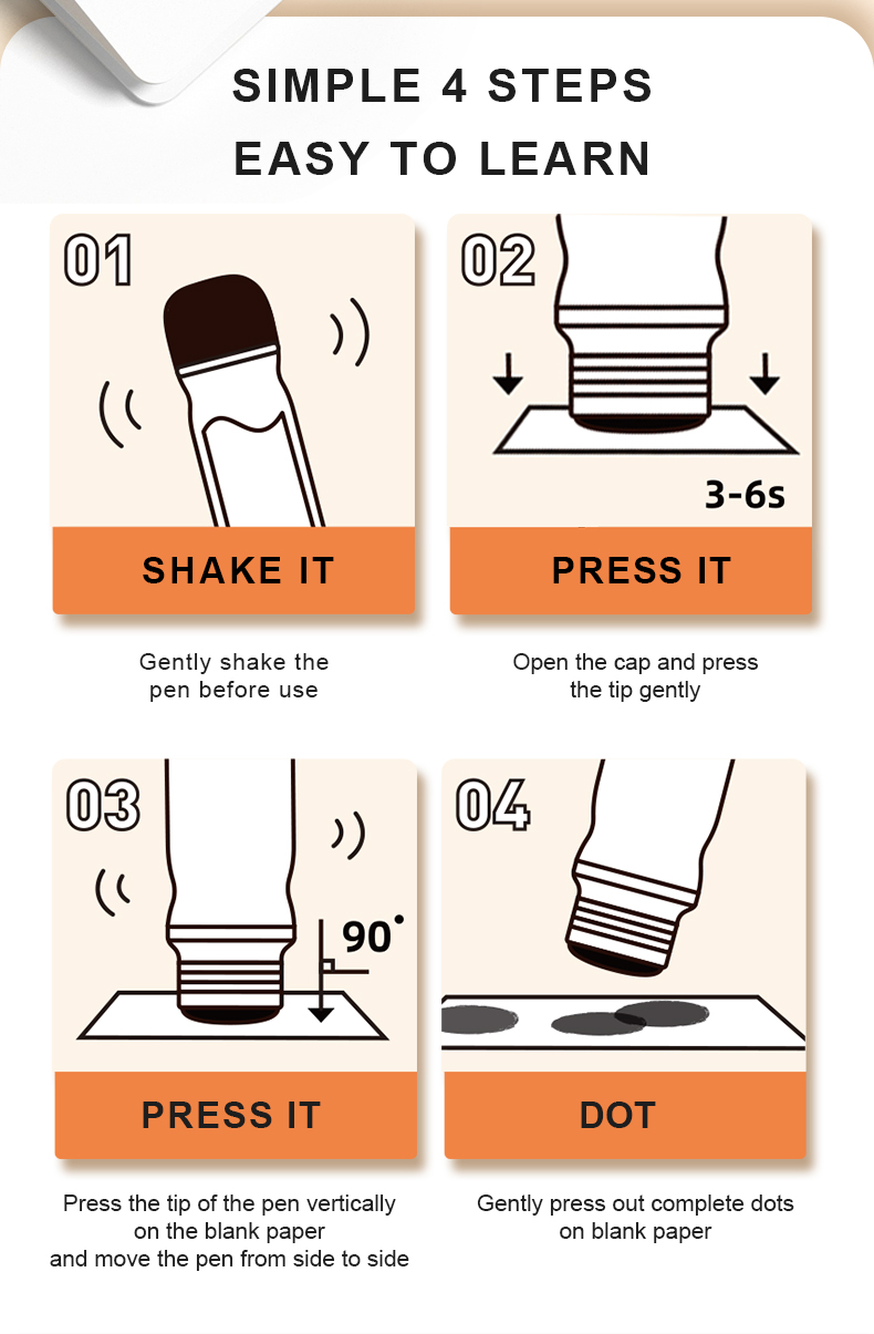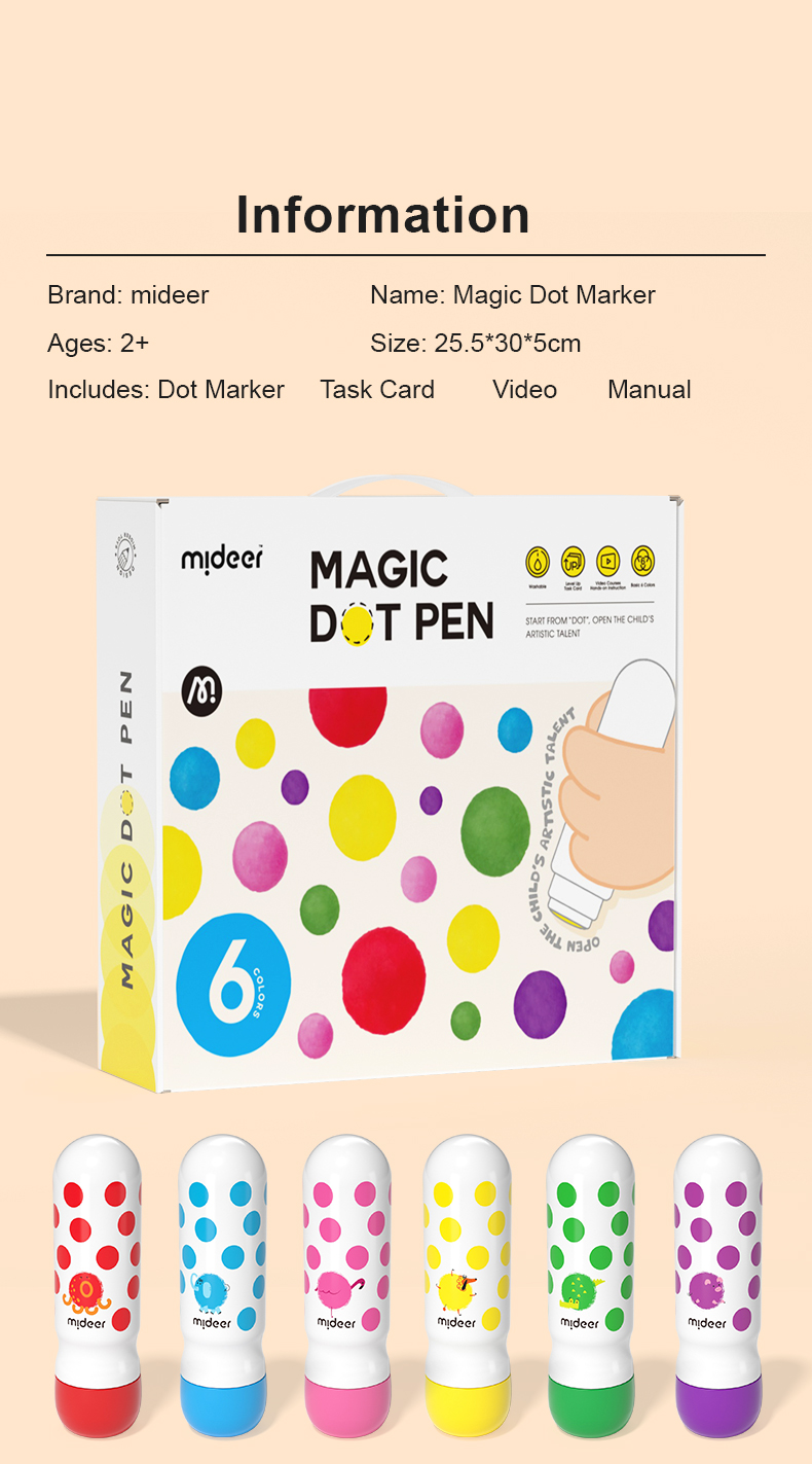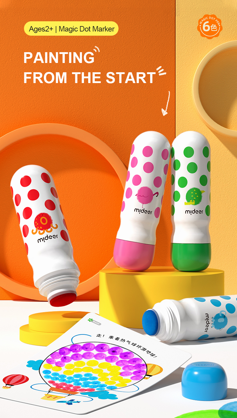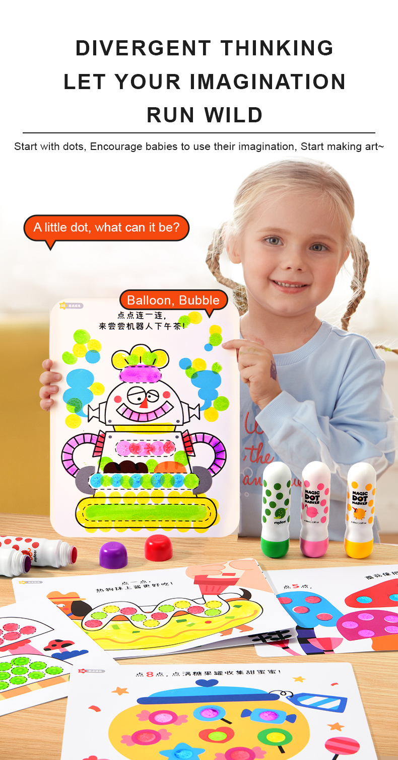 Dot dot dot, start painting journey now! Magic dot marker is professionally designed for children to draw easily. With the ergonomic design fitting small hands, the child grasps effortlessly. Unlock your child's artistic talent by drawing dots. Basic training to overall application from three aspects: dot,line,surface. Think outside of the box, unleash kids' creativity!