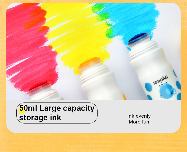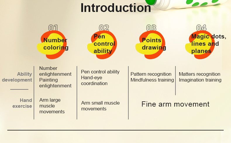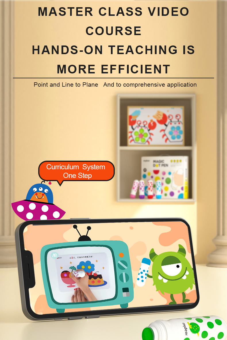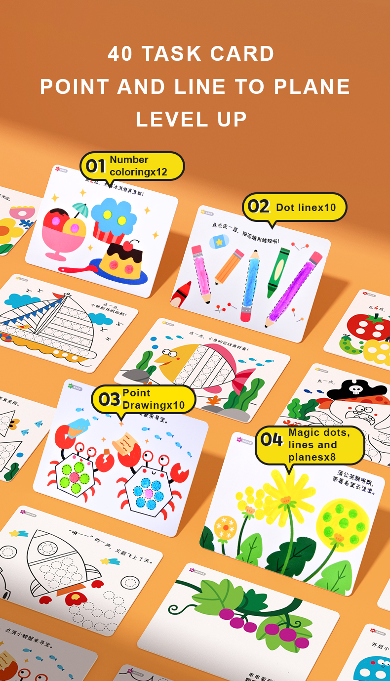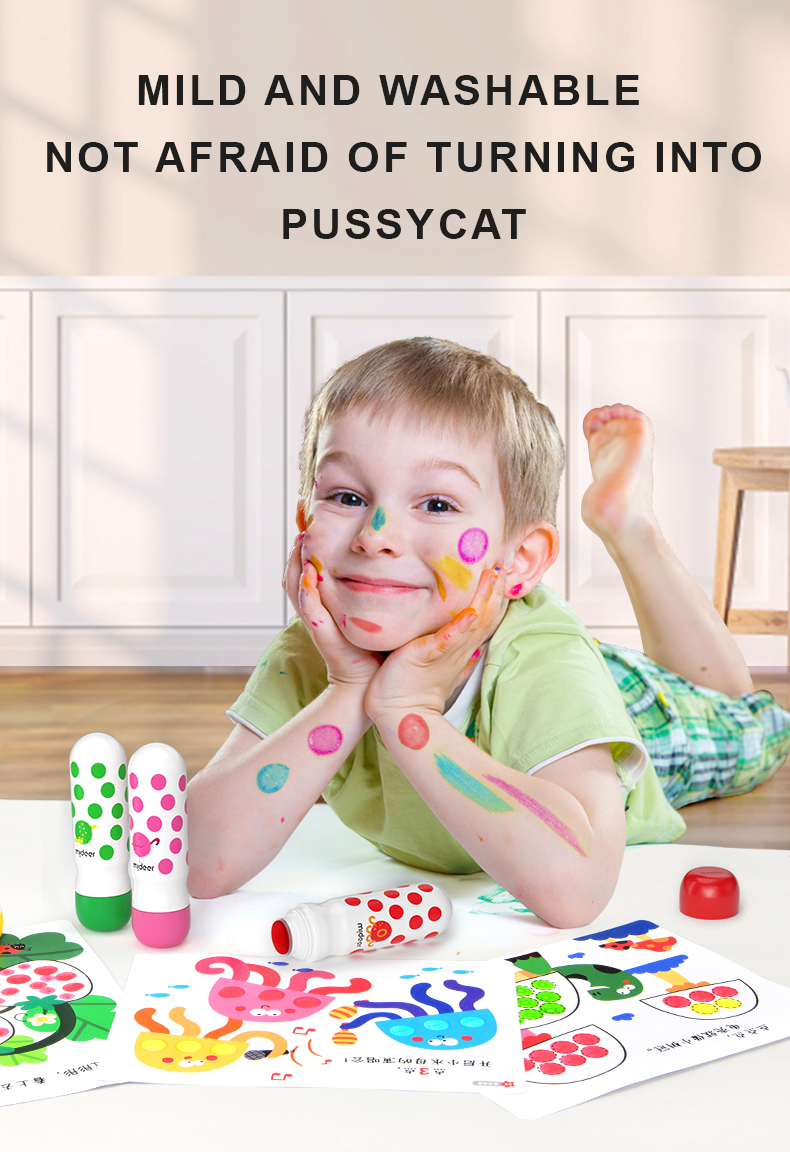 Dot dot dot, start painting journey now! Magic dot marker is professionally designed for children to draw easily. With the ergonomic design fitting small hands, the child grasps effortlessly. Unlock your child's artistic talent by drawing dots. Basic training to overall application from three aspects: dot,line,surface. Think outside of the box, unleash kids' creativity!