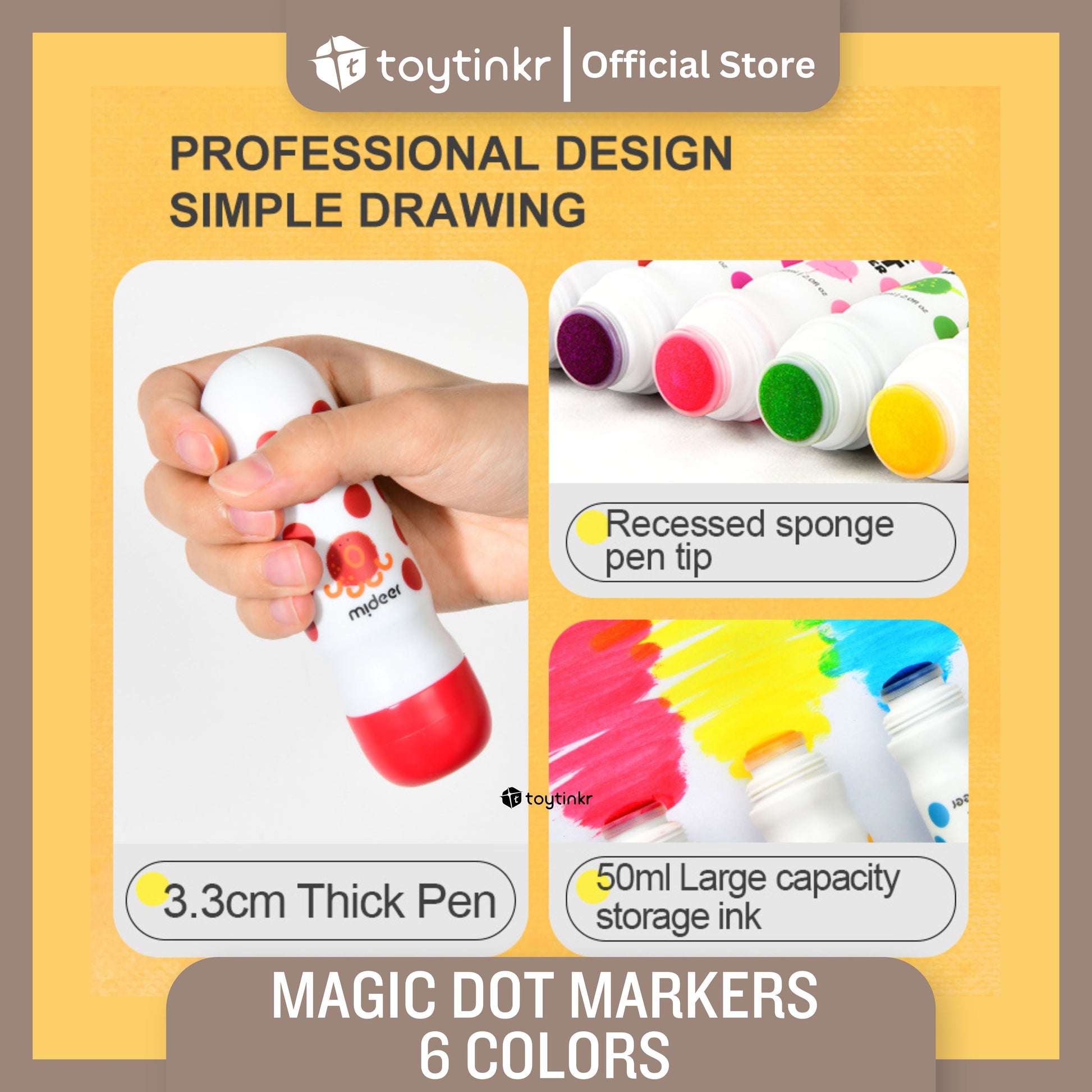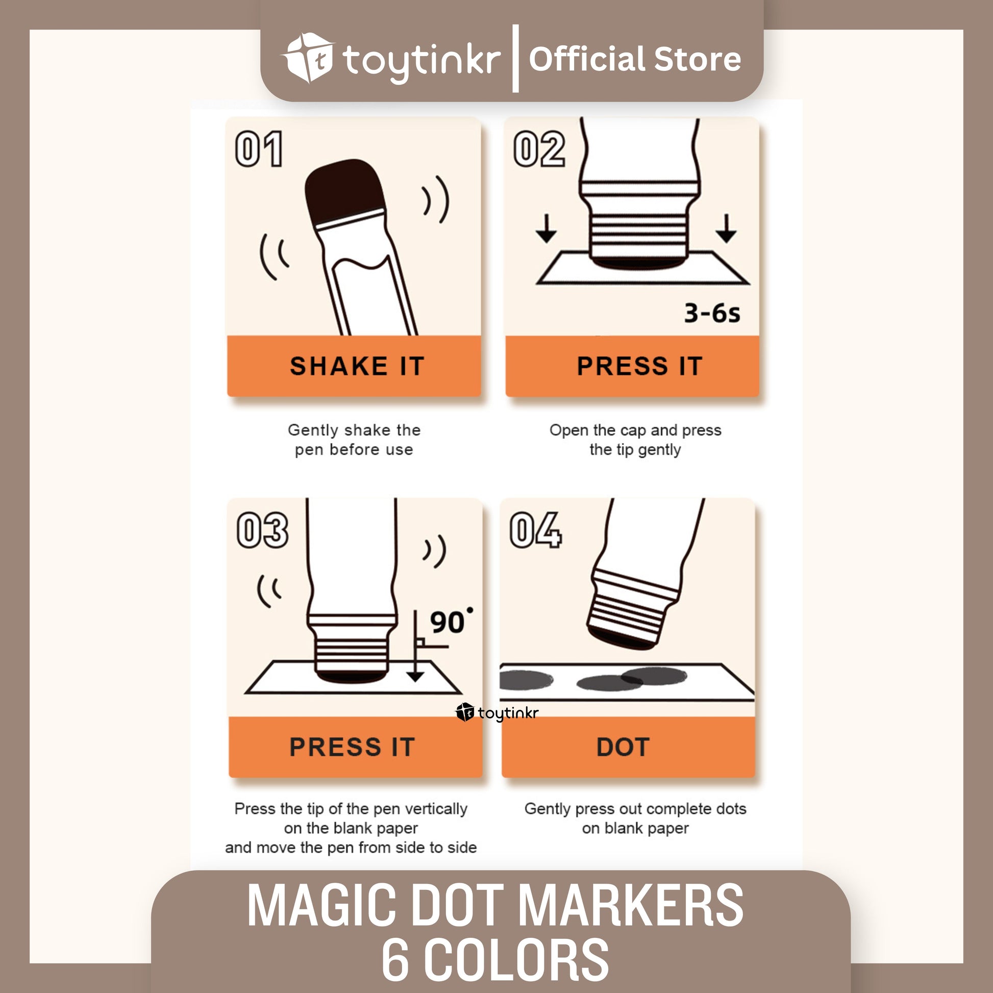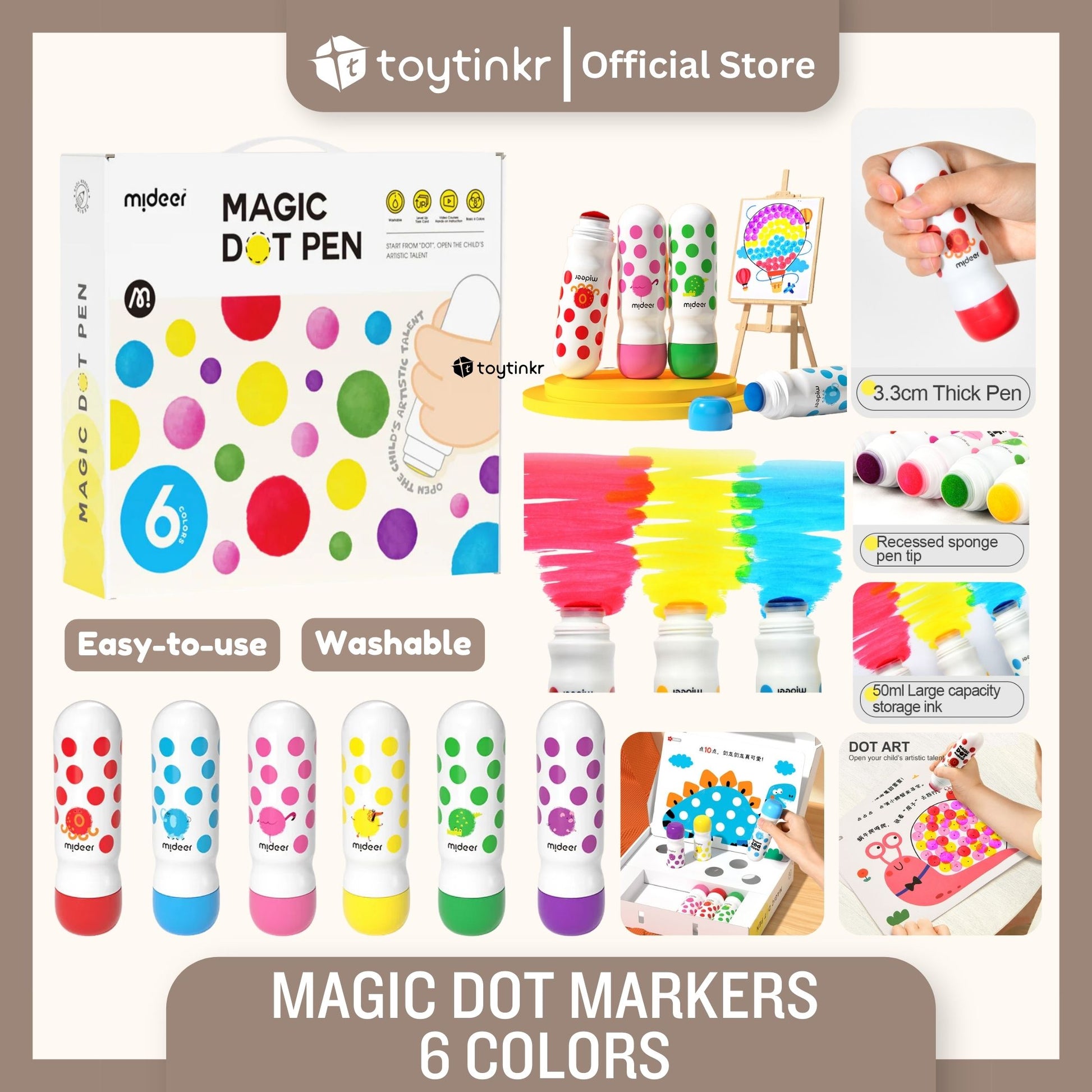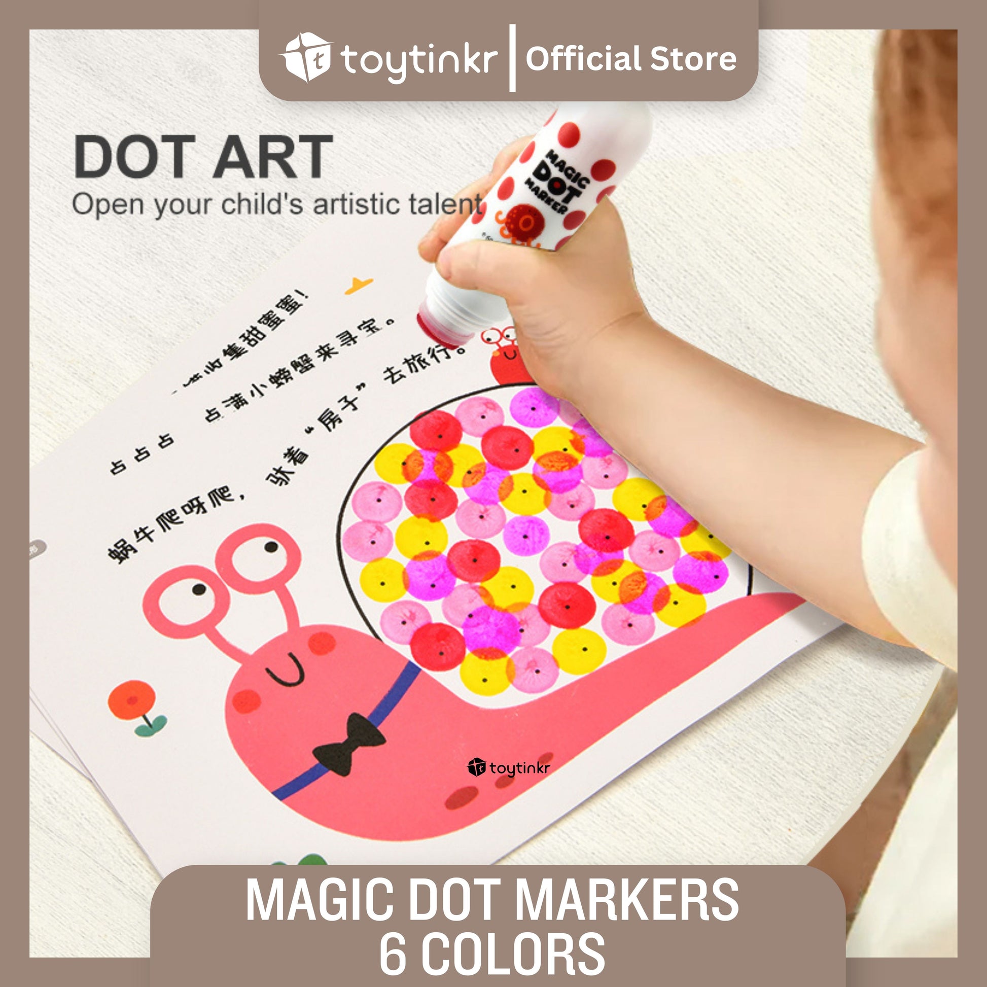 Dot dot dot, start painting journey now! Magic dot marker is professionally designed for children to draw easily. With the ergonomic design fitting small hands, the child grasps effortlessly. Unlock your child's artistic talent by drawing dots. Basic training to overall application from three aspects: dot,line,surface. Think outside of the box, unleash kids' creativity!