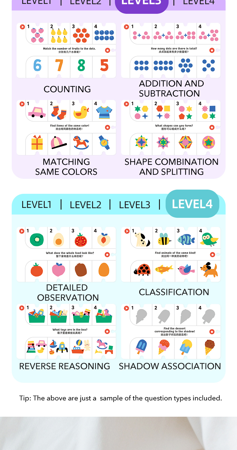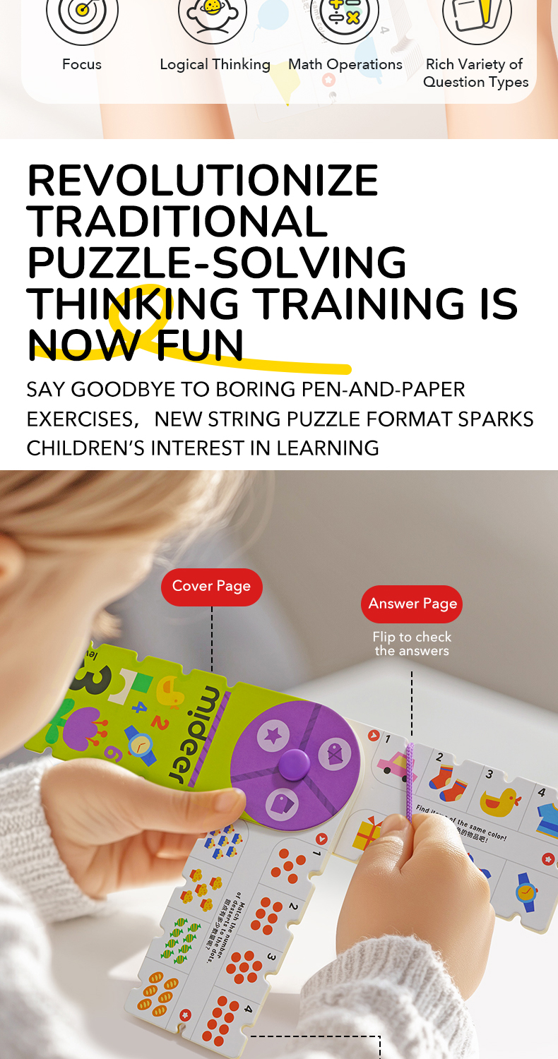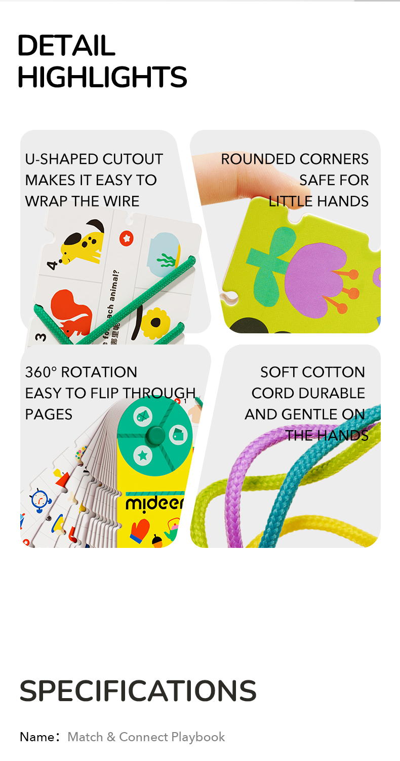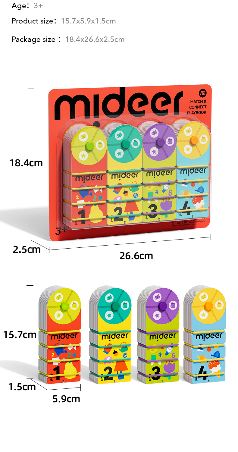 "Match & Connect Book" is an interactive brain teasers for Kids. It challenges young minds with fun quizzes that require problem-solving and critical thinking skills. With each turn of a page, kids will discover a new challenge and experience the thrill of finding the solution. Perfect for developing spatial reasoning, logic, and fine motor skills. It has 4 levels to fit different kids need. The answers to each quiz are on the back of the quiz card.
