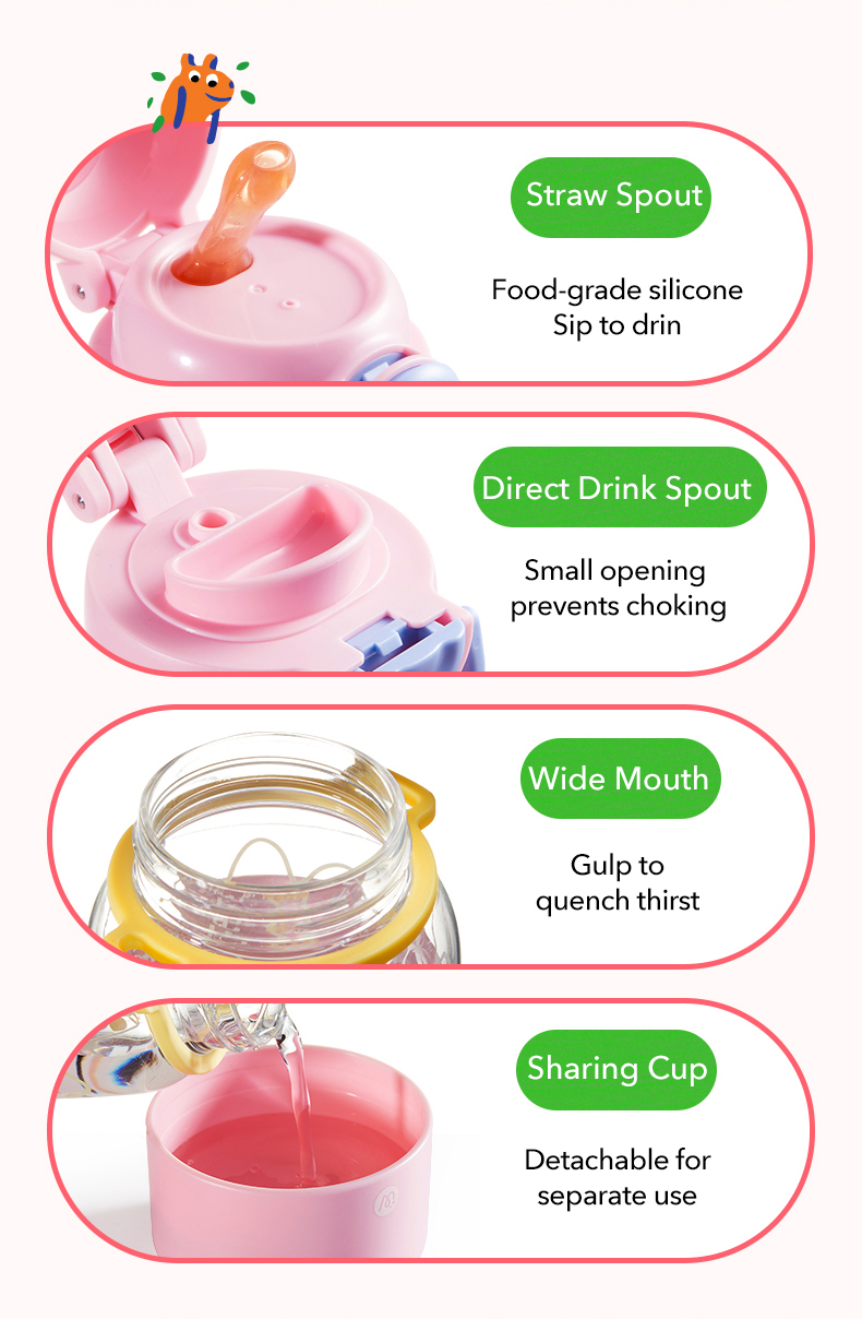 - Versatile Drinking Options: Features a unique all-in-one design with 4 drinking choices including a straw, direct drinking, wide-mouth, and a sharing cup, catering to different preferences and needs.