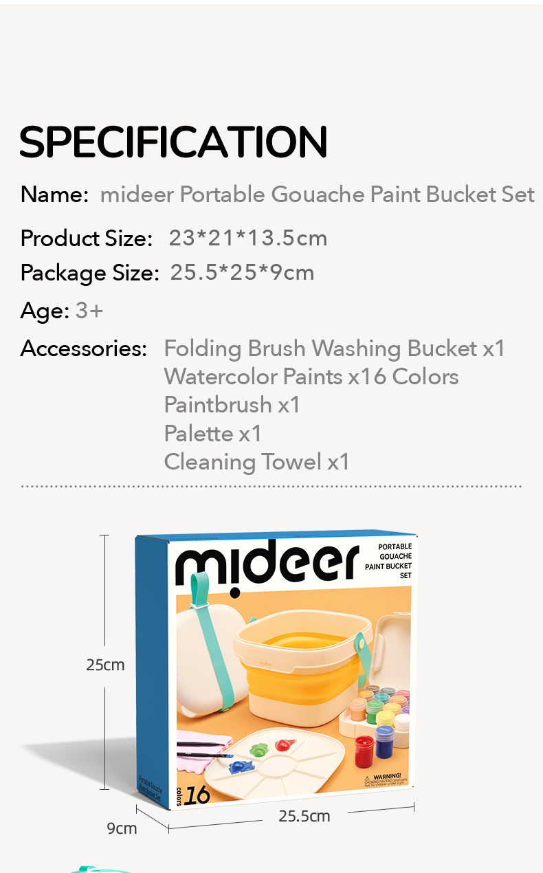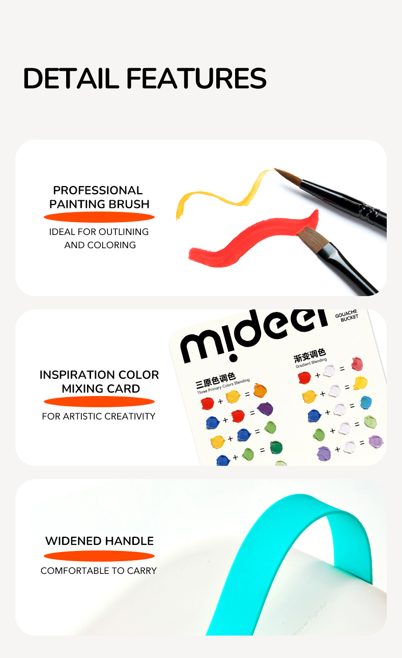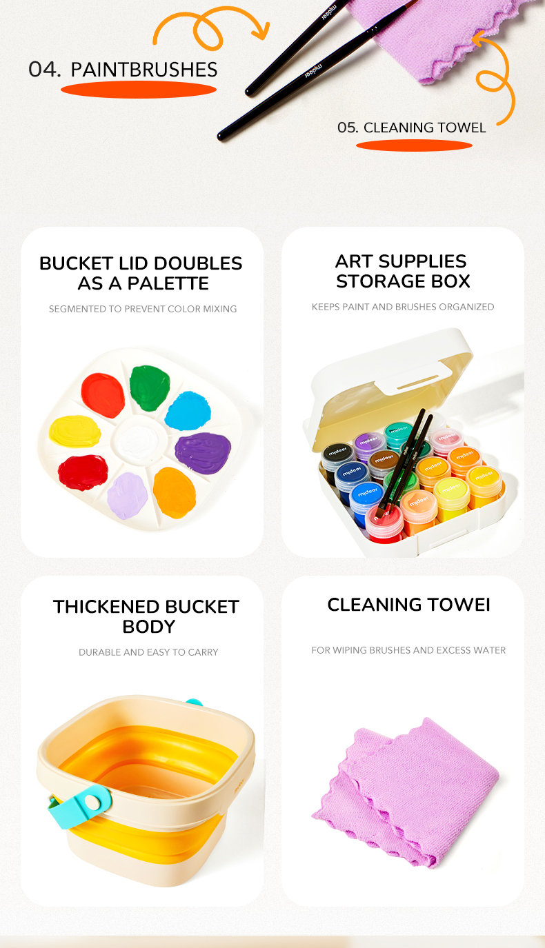- Portable Water Bucket: The foldable water bucket provides a convenient and mess-free space for painting.