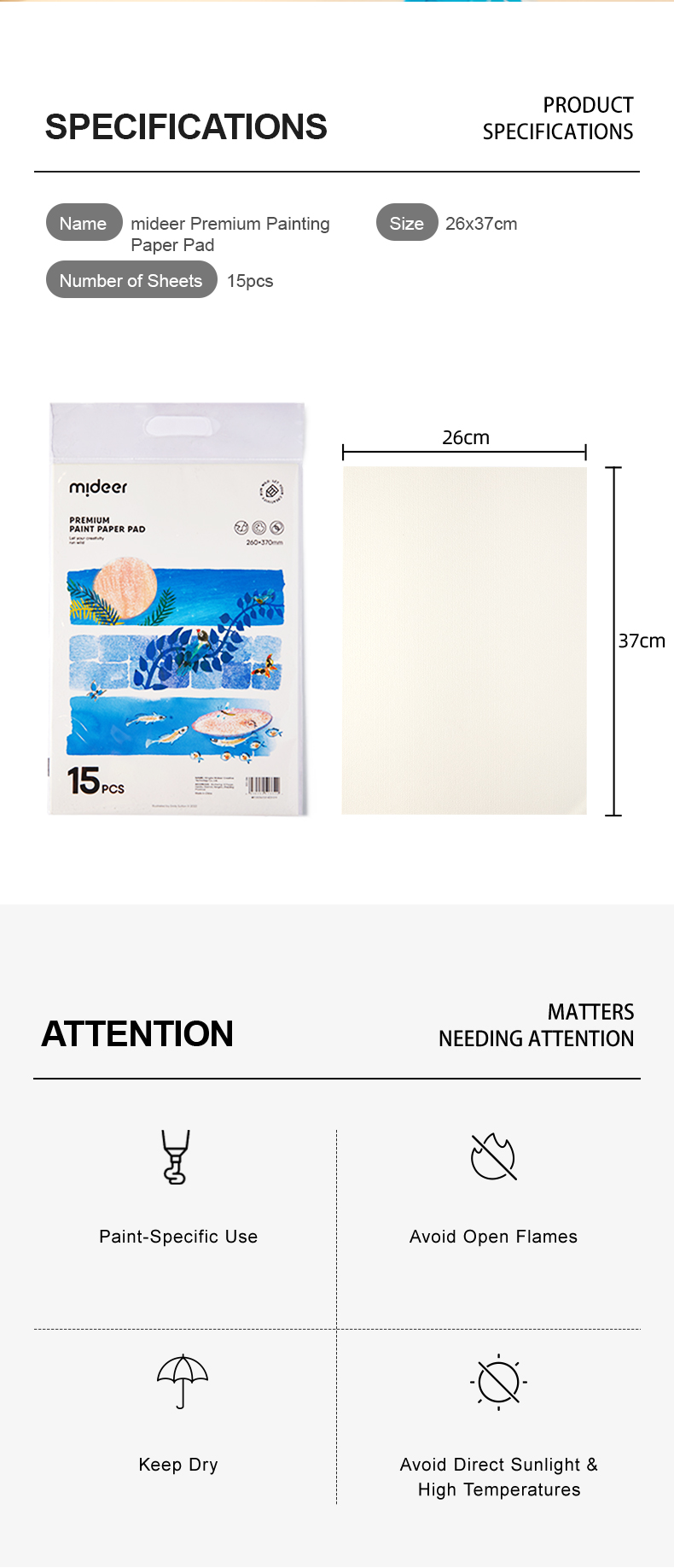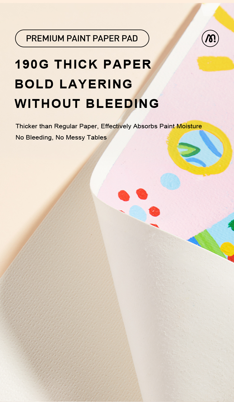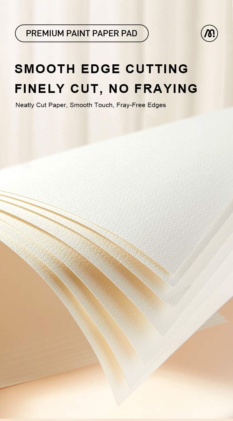 "Premium Paint Paper Pad" features thickened paper that efficiently absorbs pigment moisture, preventing bleed-through and keeping surfaces clean. With dual-sided textures, offering medium-coarse on one side and fine texture on the reverse, it caters to diverse artistic needs. Enjoy effortless layering and precise detailing on neatly cut, smooth-edged paper for a delightful painting experience.